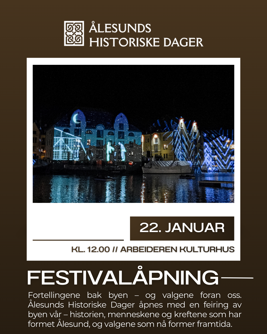 Ålesunds Historiske Dager løfter frem historiene som formet byen og menneskene som bygde den. Gjennom kunst, kultur og levende formidling skapes en møteplass for refleksjon, fellesskap og stolthet. Festivalen hedrer fortiden, men ser også fremover – for å gi historien videre og styrke identiteten til kommende generasjoner.