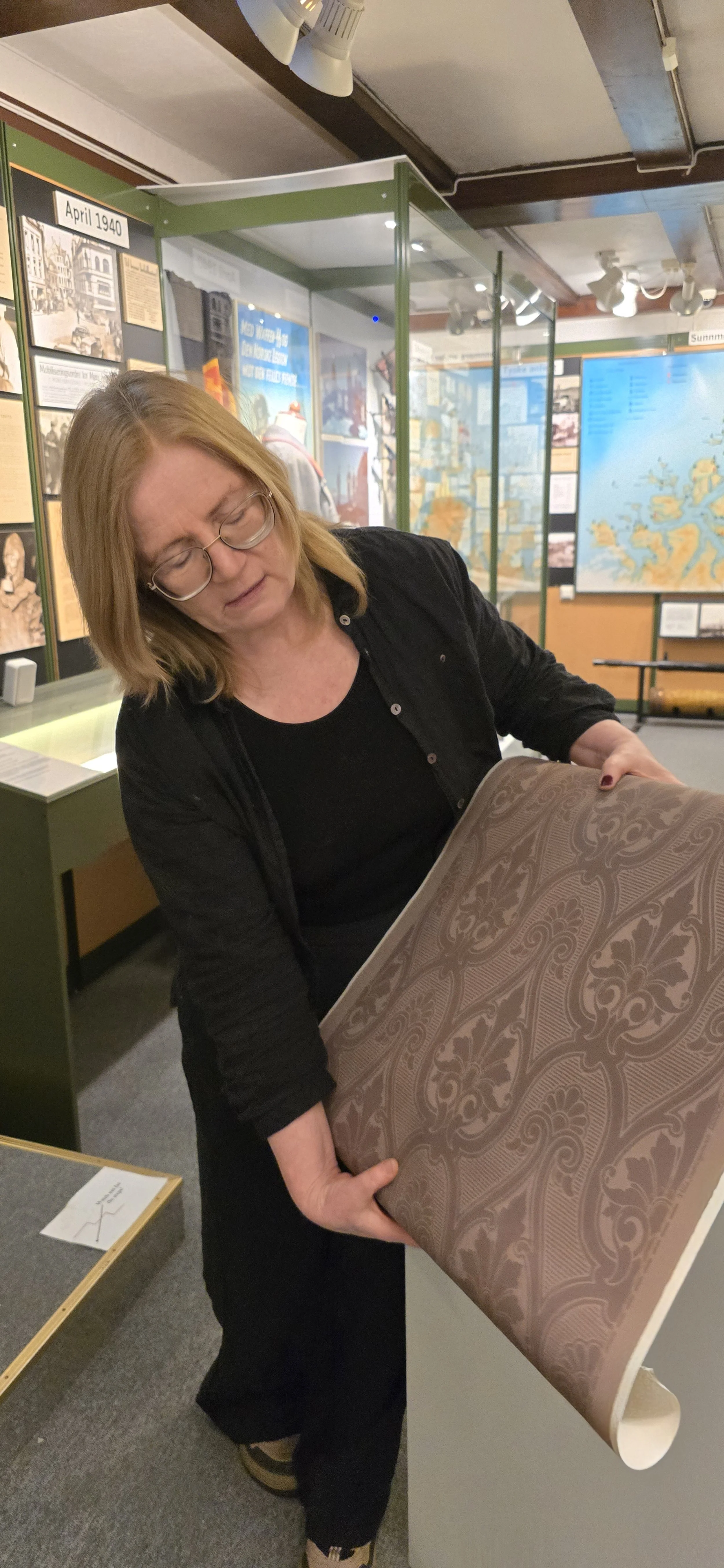 Detaljene er viktige: Inger Christine Årstad holder frem tapeten som skal prege den sivile delen av utstillingen som nå tar form midt i krigsutstillingen i kjelleren.