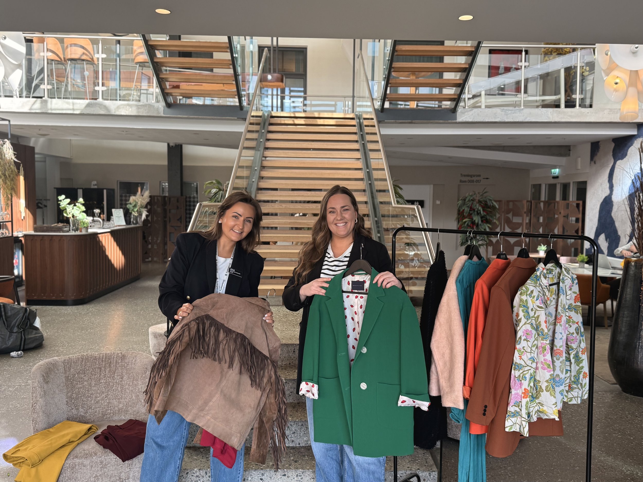 Veronika Valdal og Julia Teige ved Quality Hotel Waterfront gleder seg til “Den store Klesbyttedagen”, og er allerede omgitt av innleverte skatter som snart får nye eiere.