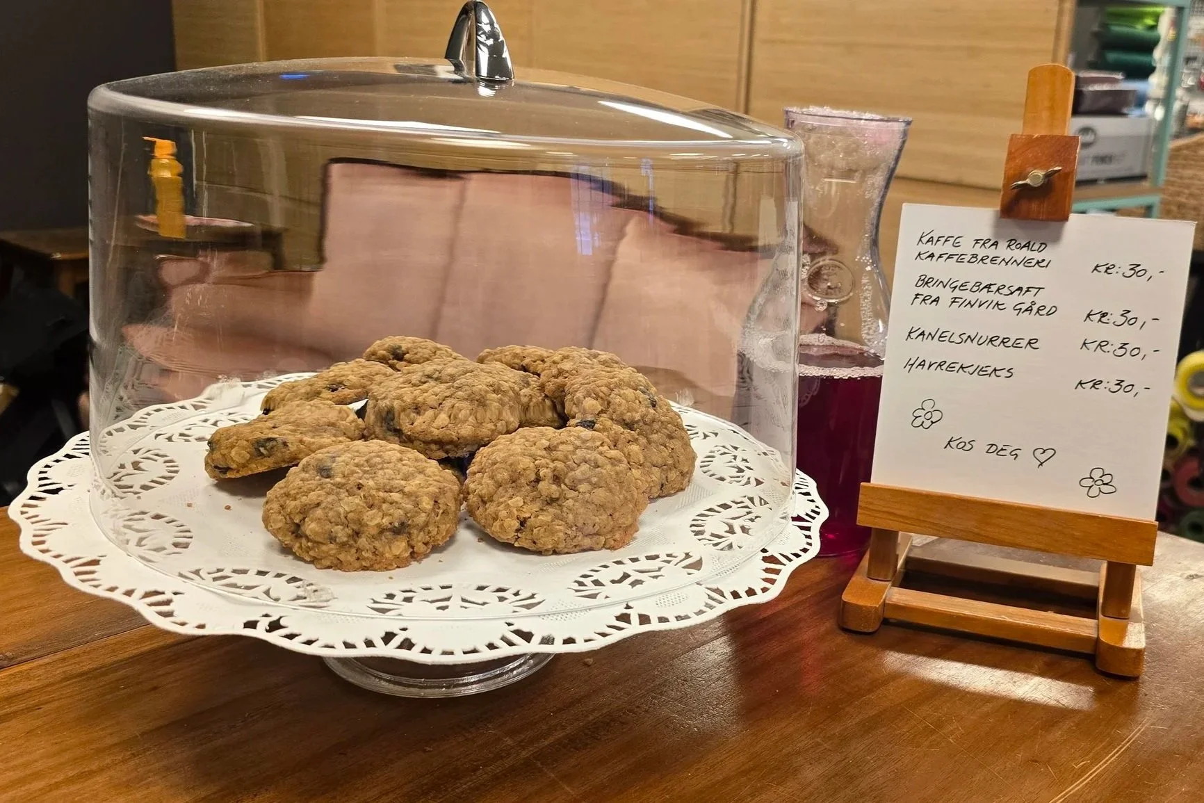 Man kan slå seg ned med en kopp kaffe, kjøpe en hjemmelaget havrecookie eller en kanelbolle, eller kanskje et glass saft fra Finvik gård, produkter som også selges i butikken.